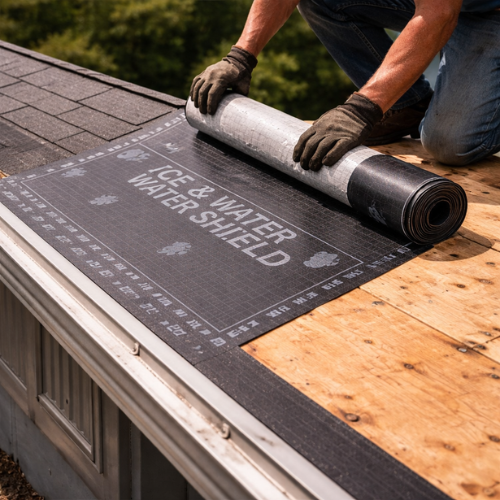 Ice and water shield is a self-adhering membrane installed beneath the shingles in vulnerable areas of the roof. It creates a watertight barrier that protects the underlying structure even when ice dams force water back up the slope. For NJ homeowners, it’s not an optional upgrade — it’s a critical part of a properly built roofing system.